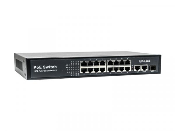- 16 портов PoE 10/100 Мбит/с: Каждый порт обеспечивает передачу данных и подачу питания по одному кабелю в соответствии со стандартами IEEE 802.3af/at.