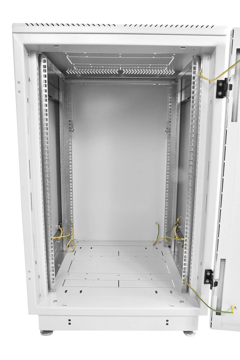 Шкаф поставляется с четырьмя винтовыми опорами, компенсирующими неровности поверхности для установки. Покрытие швеллеров и направляющих — оцинковка, листовых деталей — порошковая полимерная шагреневая краска с предварительным фосфатированием. Защита собранного шкафа от влаги и пыли — IP20. Размер — 600×800×1360 мм, вес — 71.28 кг.