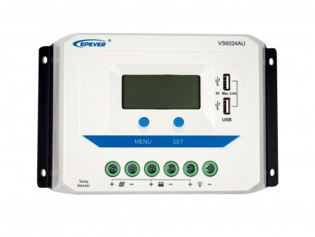 Контроллер заряда VS6024AU имеет встроенный ЖК-дисплей и USB-порт. Предусмотрено несколько режимов управления нагрузкой, позволяющих применять контроллер в солнечной домашней системе, системе безопасности, автономной системе освещения и т.д. Электроэнергия от модуля, может передаваться аккумуляторам без регулирующих устройств или через контроллер.
